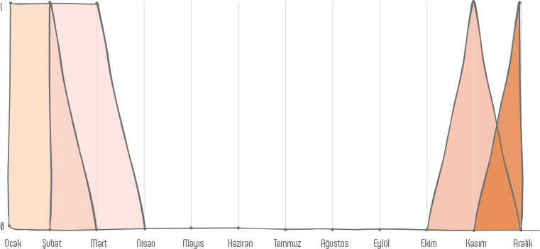 dönemleri aylara yayılmış durumdadır. Meyve kabuk renkleri açık sarıdan koyu kırmızıya kadar